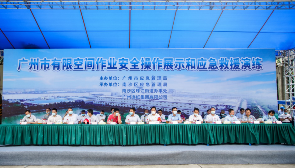 在公司领导的高度重视下,通过新产品分厂、办公室、人力资源部、采购部、生产部、物流管理部、园区发展部等部门的积极配合,广州市有限空间作业安全操作展示和应急救援演练于8月26日在公司成功举办。市应急管理局党委书记、局长黄彪、南沙区常务副区长谢明、越秀集团副总经理谭思马和公司党委书记、董事长周耘出席了本次活动,各区应急管理局和珠江街主要负责人、市有限空间作业重点企业代表、越秀集团安监部和各板块安全责任人及公司AB类部门共160余人现场观摩演练。