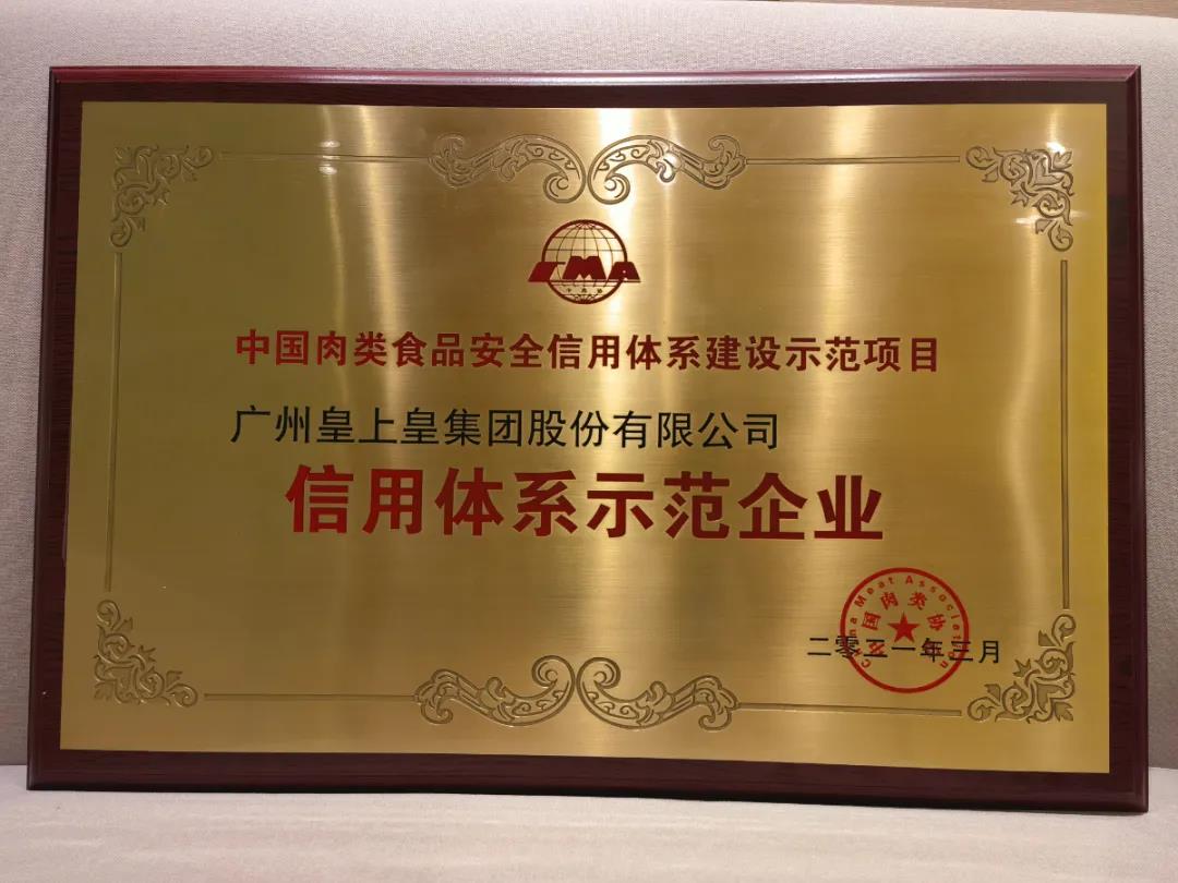 “中国肉类食品安全信用体系建设示范项目”是中国肉类协会根据国务院发布的《社会信用体系建设规划纲要》和中国肉类食品行业发展要求,开启具有食品行业规范作用的示范项目。项目每年发布示范企业信息,代表的是品质、安全、放心和诚信,目前参与该项目的均为肉类行业标杆或龙头企业。大会期间,皇上皇集团还被授予“2021中国肉类食品行业先进企业称号,“皇上皇”品牌荣获“2021中国肉类食品行业最具价值品牌
