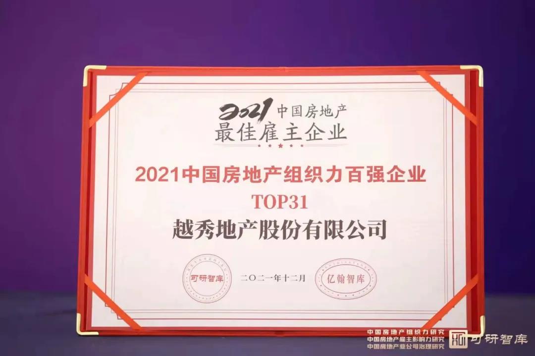 “2021中国房地产业组织管理峰会”暨“中国房地产企业(第二届)CHO联席会”成功召开,并发布了《2021中国房地产组织力研究报告》、《2021中国房地产雇主影响力研究报告》等重磅行业报告。凭借突出的组织建设水平及不断升级的人才结构,越秀地产获得“2021中国房地产最佳雇主企业”殊荣,并跻身2021中国房地产组织力百强企业。