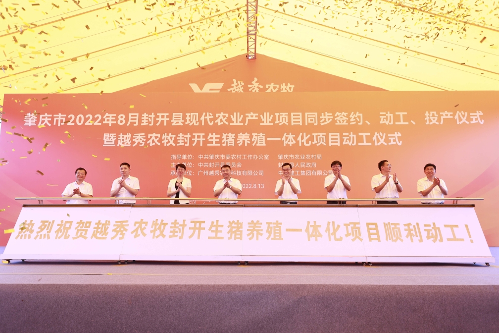 8月13日,肇庆市封开县现代农业产业项目同步签约、动工、投产仪式暨越秀农牧封开生猪养殖一体化项目动工活动在肇庆市封开县金装镇举行。越秀集团下属越秀农牧封开生猪养殖一体化项目、皇上皇肇庆肉制品加工中心项目同步开工,这标志着越秀集团大力发展现代农业,聚焦大湾区在广东省内布局生猪养殖全产业链取得重要实质性进展,标志着越秀集团与肇庆市在现代农业领域的合作向更深层次、更广领域、更高水平迈进。肇庆市委书记张爱军,市委常委、组织部部长李克俭,市委常委、封开县委书记秦波,越秀集团党委书记、董事长张招兴,以及肇庆市、封开县有关单位领导和企业代表等近百人现场参加活动。